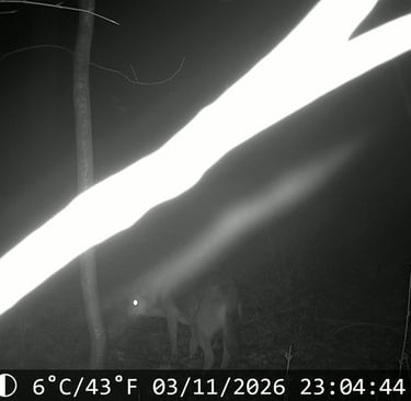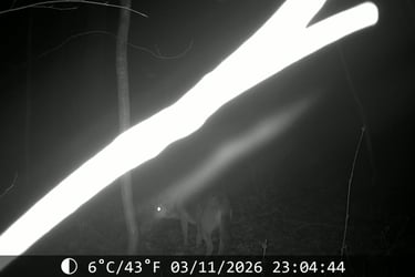 Dienstagabend ein dritter Hinweis: Ein Jäger aus einem 16 Kilometer entfernten Ort (in der Nachbargemeinde) ist sich gemeinsam mit seinem Sohn sicher, Goran auf der Hauptstraße gesehen zu haben. Er wusste (natürlich) nichts von GORAN, hat eine befreundete Tierarzthelferin angerufen, die uns bei Tasso entdeckt hat. Wow, wie sich später (Donnerstag) herausstellte, war es tatsächlich GORAN. Diese Hunde (es handelt sich um einen Straßenhund aus Rumänien) laufen hauptsächlich in der Dämmerung und bewegen sich relativ sicher, auch über größere Entfernungen. Zwischen uns und GORAN liegen drei Ortschaften! Nun hatten wir einen neuen ziemlich genauen Ort, wo er zuletzt gesehen worden ist. Also erste Futterstelle und Kamera und Hinweisschilder ab- und an neuem Ort anbauen. Ich habe es für Zeitverschwendung gehalten, da ich nicht glauben konnte, dass wir (im strömenden Regen) in einer Region mit gefühlt tausenden von Bäumen, den Baum finden, an dem wir unsere Wildtierkamera und eine Futterstelle anbringen, die am nächsten Tag tatsächlich Filme und Bilder von GORAN liefern würden. Unsere Kontaktperson von der Suchhundestaffel, die das vehement empfohlen hatte, hatte recht! Das Bild rechts ist nur ein Beispielbild, die Kamera hat diverse Bilder und Videos erstellt, auf denen wir GORAN hundertprozentig identifizieren könnte. Zugegeben, wenn man GORAN so im Dunkeln sieht, könnte man ihn für einen Wolf halten. Aber er ist nur kniehoch!