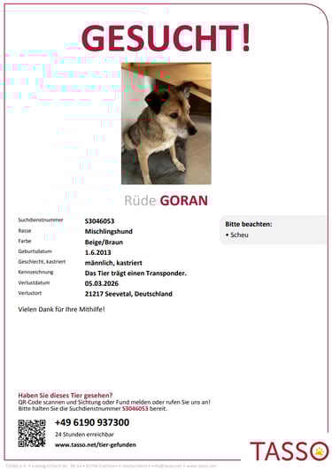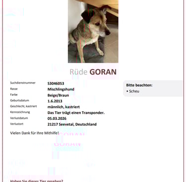 Sollten Sie einmal in die Situation kommen, dass Ihr Hund entläuft, finden Sie hier ein Protokoll unserer Suche nach GORAN. Vielleicht entdecken Sie die eine oder andere Anregung, die Sie bei Ihrer Suche noch mit einbinden können.